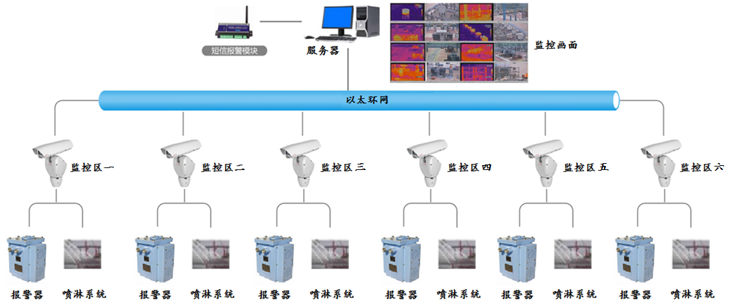 系统采用先进的图像型感温火灾探测技术,通过非接触方式对目标实时监控,集光电成像技术、计算机技术、图像处理技术于一身,能侦测到火灾发生前的危险高温信号,提前预警,避免火灾发生后的被动损失。系统架构如下图所示: