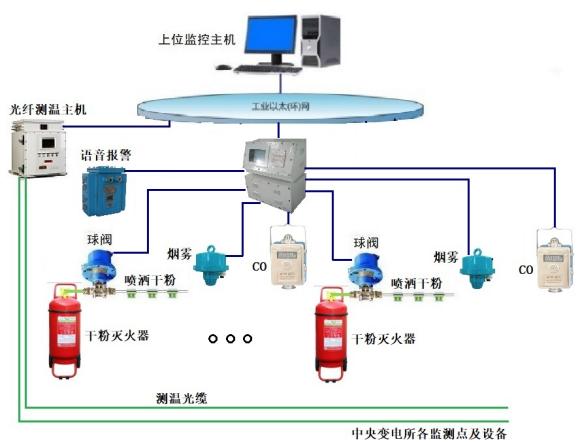 系统构架 上位监控中心:含监控主机、软件及声光预警,为系统核心; 矿用分布式光纤装置:含主机与监测光缆,实现温度 / 振动连续监测;