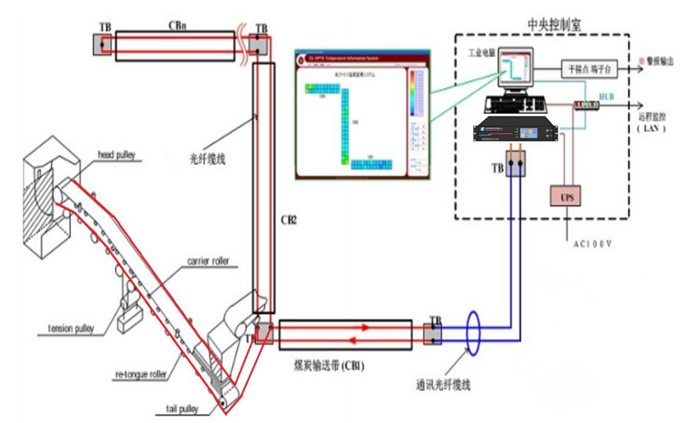 分布式光纤测温测振系统主要由系统服务器、光纤监测系统软件、分布式光纤测温测振主机、测温光缆、测振光缆及其他附属设备构成。该系统以激光脉冲在光纤中传输产生非线性散射效应——拉曼散射原理为技术基础,结合光时域反射技术(OTDR)实现连续测量光纤沿线任一点所处的温度及振动值,其测量范围可达几十公里,空间定位精度可达1米,监测报警同时可联锁设备停机。该系统解决了人工巡检周期长、强度大、响应不及时等问题,通过对火灾隐患、设备故障做到早期预报和及时报警,保障了设备的有效运行,降低或避免了事故造成的人员伤害和财产损失,为实现从单点的温度、振动监测向线、面、空间的温度、振动监测发展创造了实质性的条件。